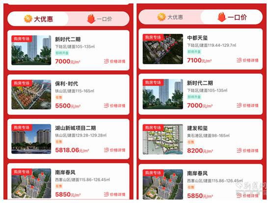線上,該市在東楚優(yōu)房APP上,開(kāi)辟“‘宜居黃石’春節(jié)返鄉(xiāng)安居”購(gòu)房專版,各房地產(chǎn)開(kāi)發(fā)項(xiàng)目按照自愿原則拿出房源,下設(shè)“一口價(jià)”和“大優(yōu)惠”2個(gè)專欄?!耙豢趦r(jià)”專欄集中展示特價(jià)房源;“大優(yōu)惠”專欄集中展示特價(jià)房外的其它優(yōu)惠房源。