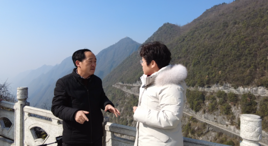 記者(右一)在采訪現(xiàn)場(chǎng)了解壁掛公路相關(guān)情況
