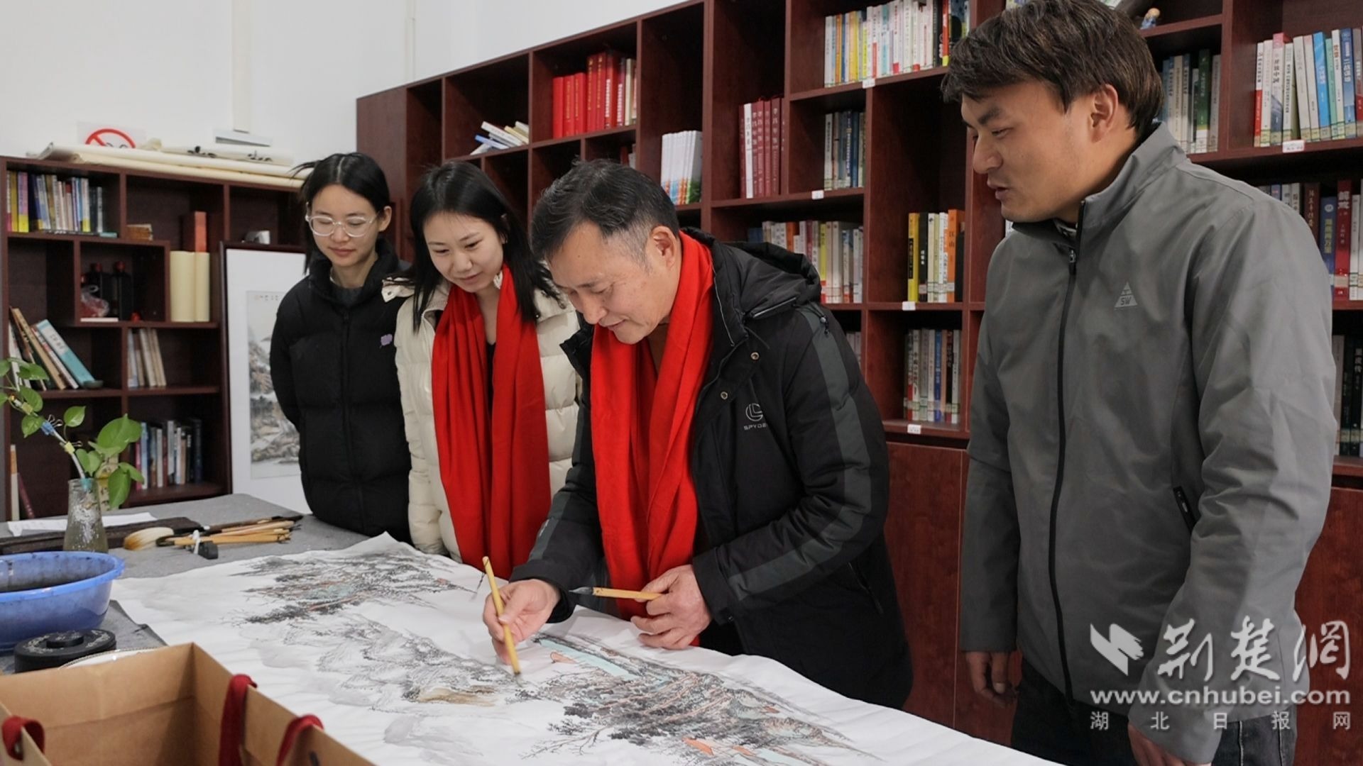 彭建勛與同事講解作畫技巧。通訊員 供圖