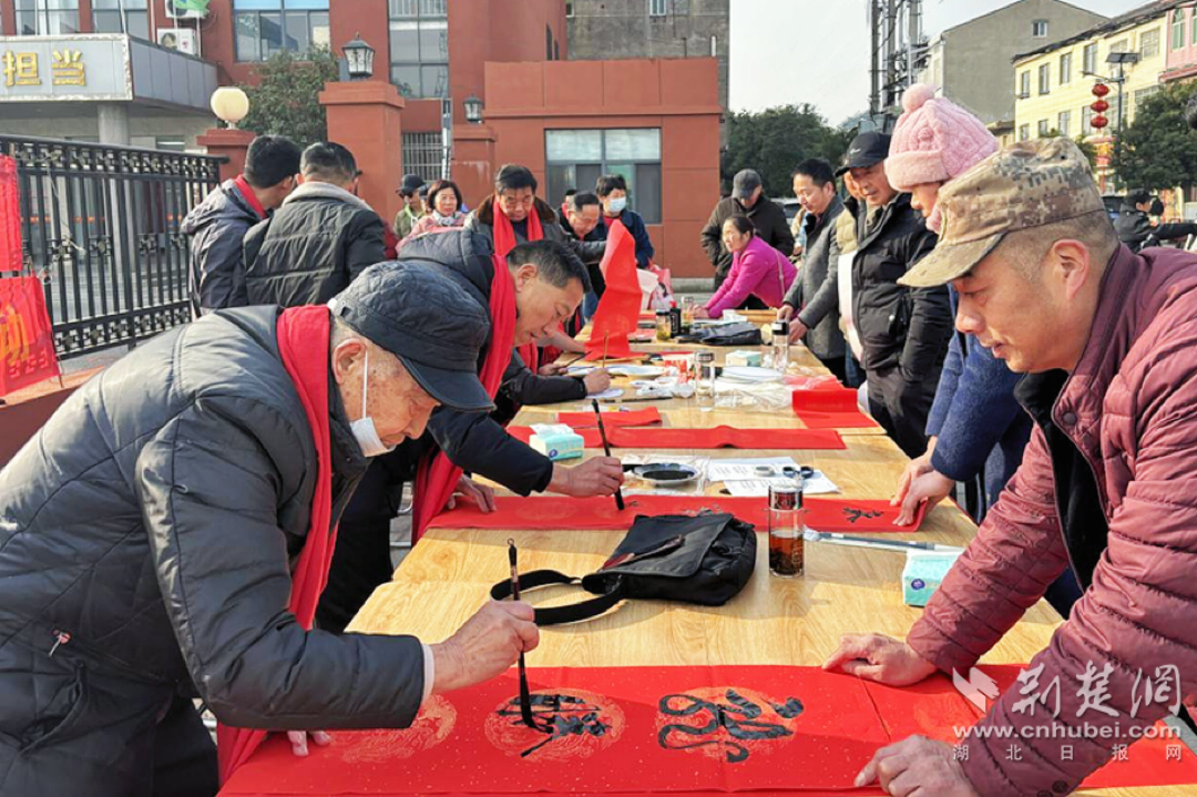 荊楚網(wǎng)(湖北日報網(wǎng))訊(記者黃菲、李好 通訊員李健初、鄒圓圓)龍騰四海辭舊歲,蛇舞九洲賀新春。蛇年春節(jié)前夕,走進(jìn)孝昌縣花西鄉(xiāng),鎮(zhèn)區(qū)主街一側(cè)格外熱鬧,案臺上紅火的春聯(lián)紙鋪陳開來,來自孝昌縣書法協(xié)會的老師們正挽袖書作,寫字的筆走游龍、一氣呵成,作畫的下筆有神、栩栩如生,傳遞著美好的新春祝愿。