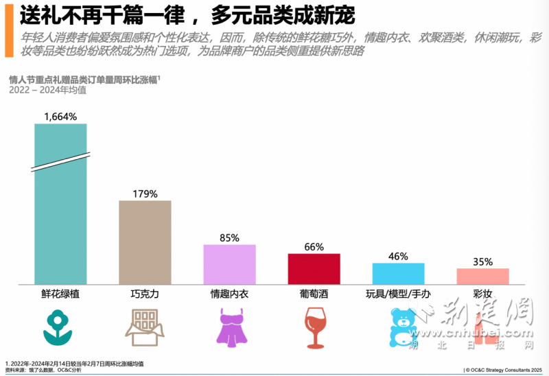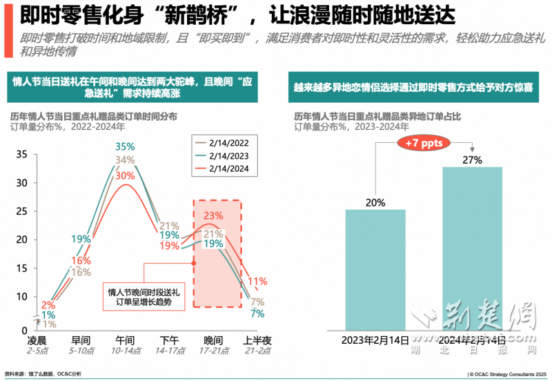 荊楚網(wǎng)(湖北日報網(wǎng))訊(通訊員 易曄)元宵才過,情人節(jié)接檔。零售品牌商戶們毫不猶豫步入下一個生意高峰,過節(jié)的愛人們也不慌不忙在節(jié)日當天開始籌備浪漫表達。近日,餓了么聯(lián)合戰(zhàn)略咨詢公司OC&C共同發(fā)布的《情人節(jié)即時零售禮贈趨勢與品類機遇洞察》顯示,過去三年情人節(jié)當天,重點禮贈品類的外賣單量較12日環(huán)比增長超過3倍,且當日送禮訂單在晚間(17-21點)需求持續(xù)增長。