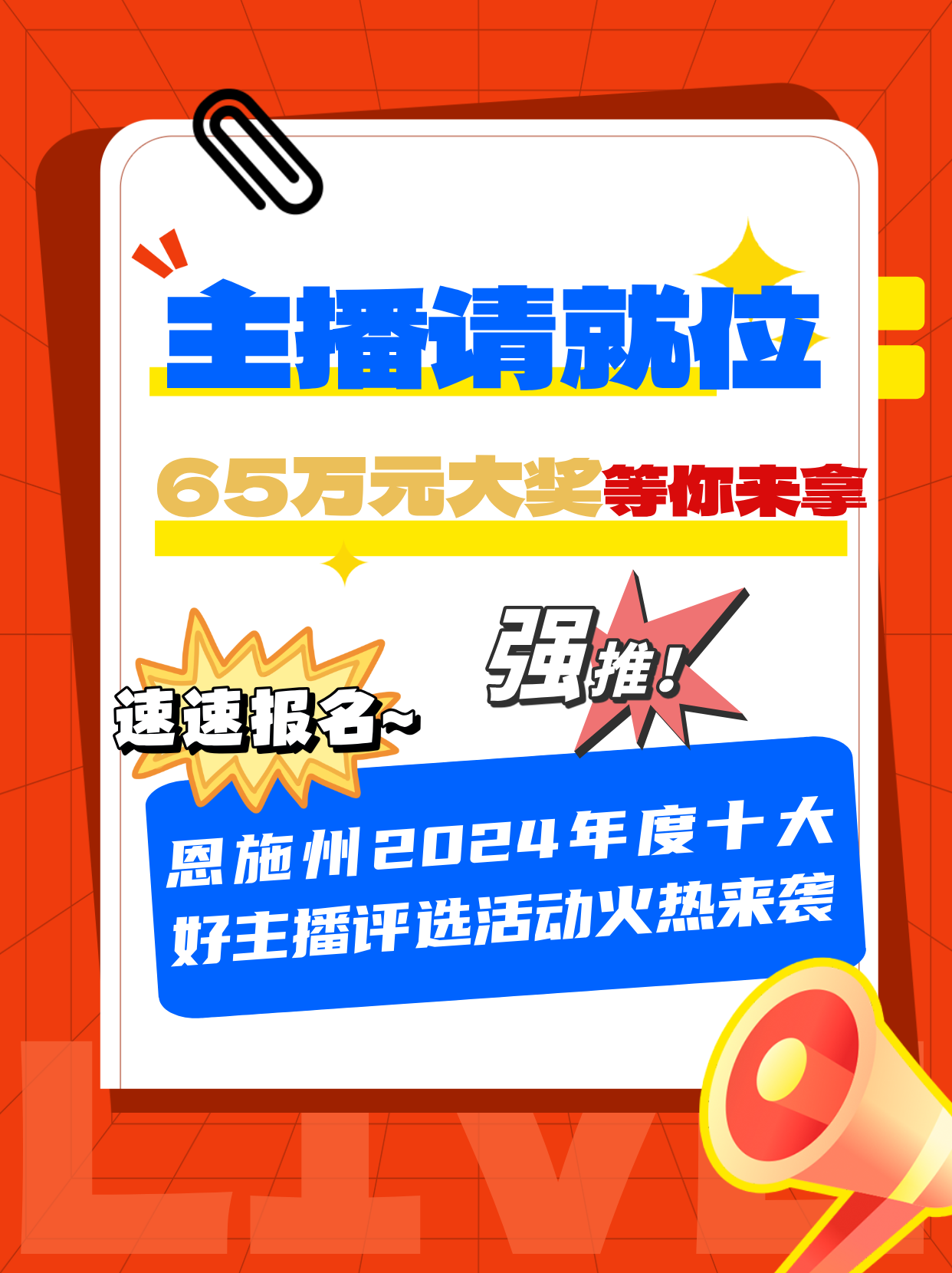 荊楚網(wǎng)(湖北日報網(wǎng))訊(通訊員鄭承偉)近日,由恩施州委統(tǒng)戰(zhàn)部、恩施州商務(wù)局聯(lián)合舉辦的恩施州千村(企)萬名好主播培育行動2024年度十大好主播評選活動啟動,十大好主播將獲得總額65萬元的現(xiàn)金獎勵。