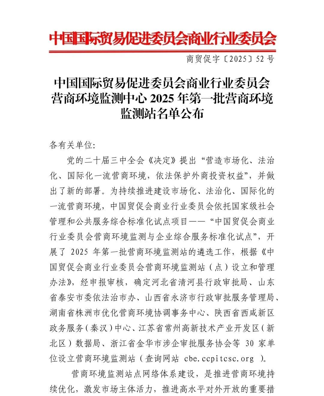 為持續(xù)推進(jìn)建設(shè)市場化、法治化、國際化的一流營商環(huán)境,中國貿(mào)促會商業(yè)行業(yè)委員會依托國家級社會管理和公共服務(wù)綜合標(biāo)準(zhǔn)化試點(diǎn)項(xiàng)目——“中國貿(mào)促會商業(yè)行業(yè)委員會營商環(huán)境監(jiān)測與企業(yè)綜合服務(wù)標(biāo)準(zhǔn)化試點(diǎn)”,開展了2025年第一批營商環(huán)境監(jiān)測站的遴選工作,根據(jù)《中國貿(mào)促會商業(yè)行業(yè)委員會營商環(huán)境監(jiān)測站(點(diǎn))設(shè)立和管理辦法》,經(jīng)申報(bào)審核,確定湖北省孝感市孝南區(qū)營商環(huán)境促進(jìn)中心、河北省清河縣行政審批局、江蘇省常州高新技術(shù)產(chǎn)業(yè)開發(fā)區(qū)(新北區(qū))數(shù)據(jù)局、浙江省金華市涉企審批服務(wù)協(xié)會等30家單位設(shè)立營商環(huán)境監(jiān)測站。