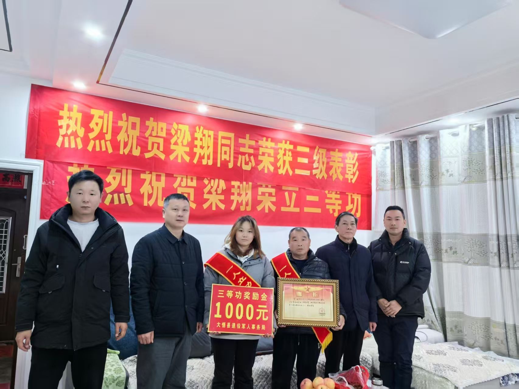 荊楚網(wǎng)(湖北日?qǐng)?bào)網(wǎng))訊(通訊員 張?zhí)K軍)五年磨一劍,軍營(yíng)建功顯本色;兩度獲殊榮,喜報(bào)送家揚(yáng)美名。2月20日,大悟縣退役軍人事務(wù)局和城關(guān)鎮(zhèn)退役軍人服務(wù)站工作人員為立功現(xiàn)役軍人送去喜報(bào)并慰問(wèn)家屬,將一份承載著榮譽(yù)的三級(jí)表彰喜報(bào)送到梁翔家中,讓軍屬共享這份榮耀。
