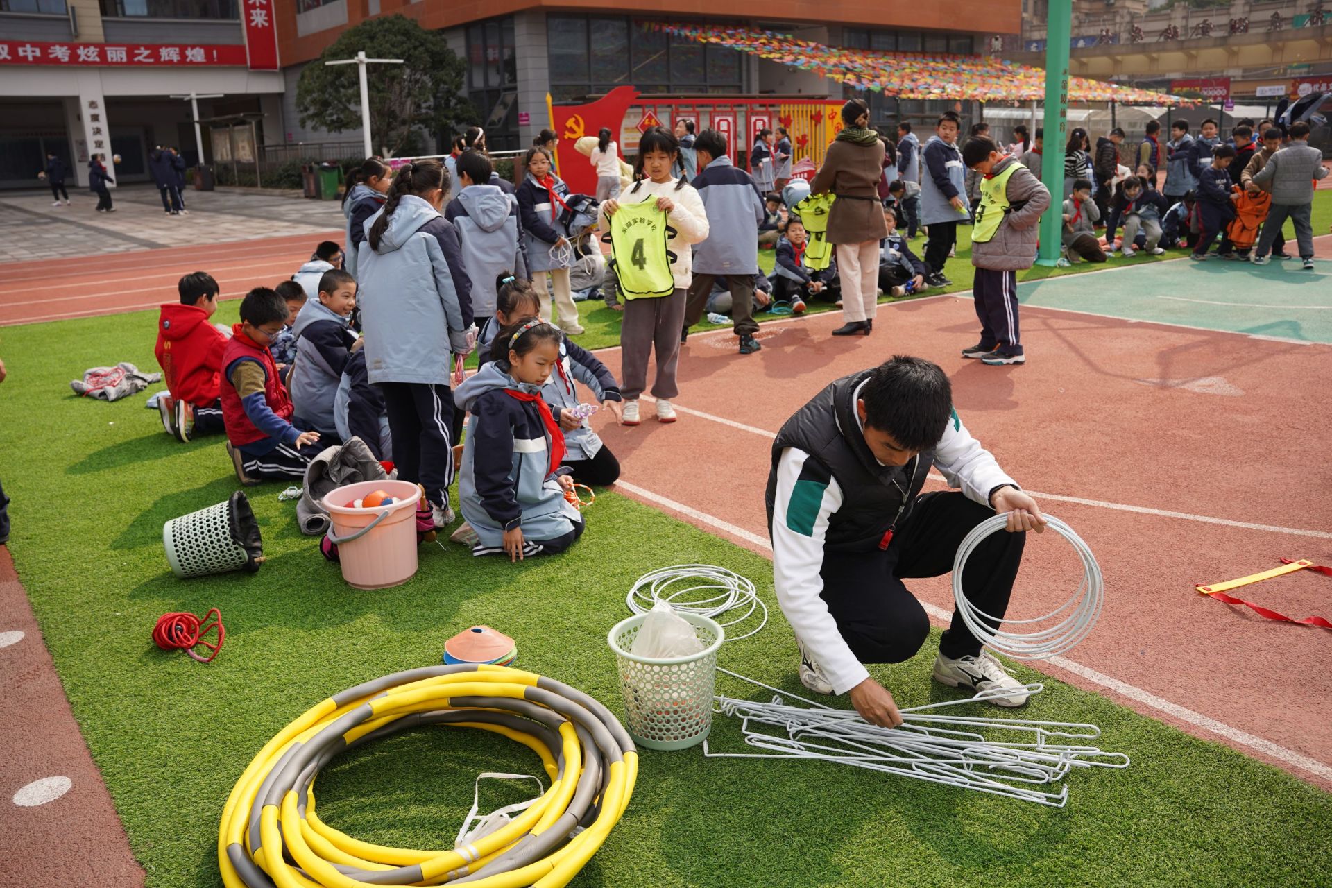東湖實(shí)驗(yàn)學(xué)校老師正在為大課間準(zhǔn)備活動器具。張媛 攝