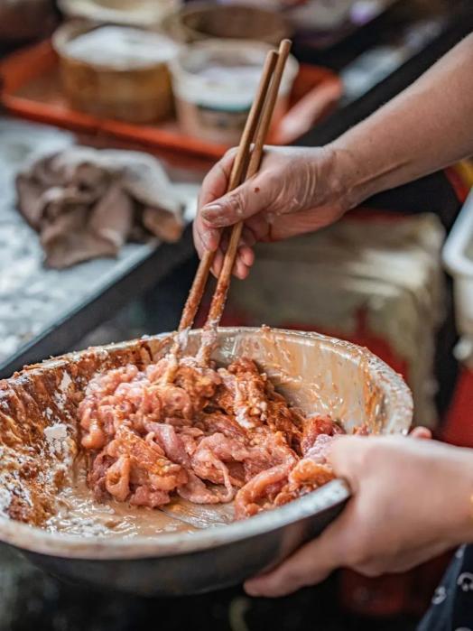 定型是制作肉糕時(shí)最考驗(yàn)功夫的一步,處理好的肉餡要均勻鋪在墊好千張的蒸屜上,不僅可以定型,同時(shí)還能吸收肉汁,使口感更為鮮美。
