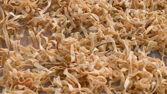 黃陂豆絲用蚌殼來(lái)制作,主要是為了攤平面糊。蚌殼材質(zhì)輕盈,便于操作使用,且蚌殼弧形的角度與農(nóng)家土灶用的鍋,貼合度高,攤出來(lái)的豆絲厚薄均勻。