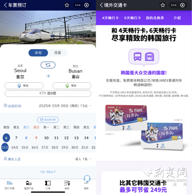赴韓游客上支付寶可查詢韓國火車的車次并選座買票,還能買更實(shí)惠的暢行交通卡。通訊員供圖