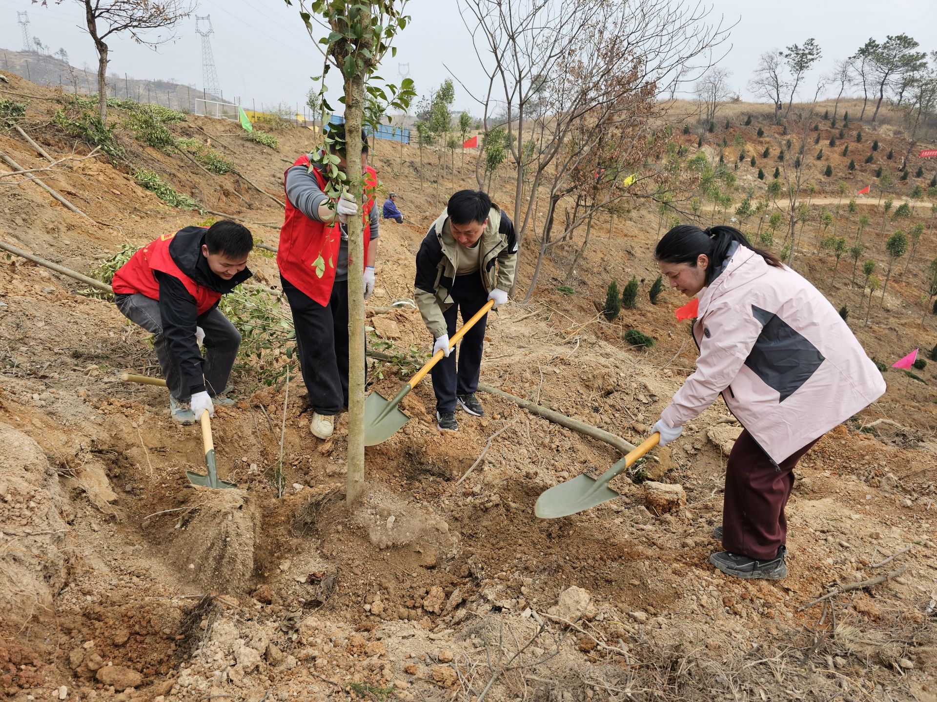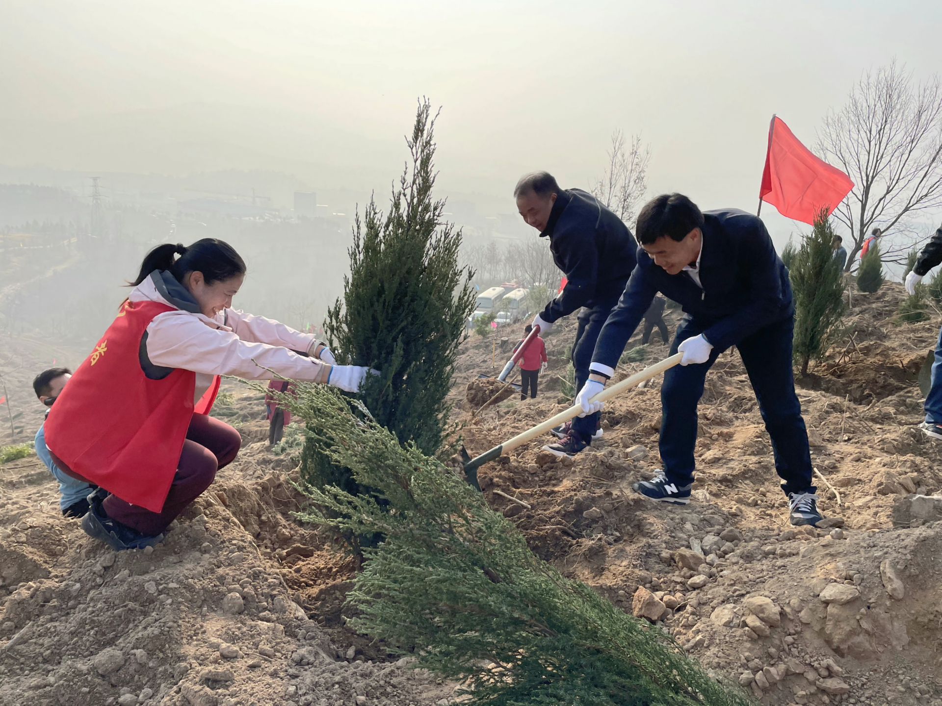 來自全縣各單位各部門的黨員干部和附近群眾組成的3000余名志愿者組成的植樹大軍,熱情高漲,干勁十足,揮鍬鏟土、扶苗填坑、培土澆水,每一個環(huán)節(jié)都一絲不茍,每一個步驟都井然有序。一株株新栽下的樹苗迎風(fēng)挺立,展現(xiàn)出勃勃生機(jī)。