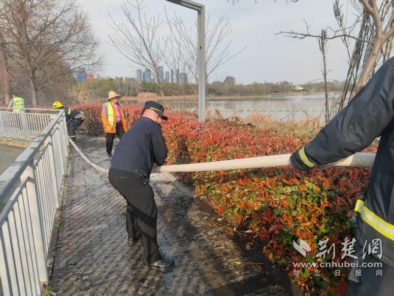 當(dāng)日下午,東湖風(fēng)景區(qū)城管執(zhí)法局四中隊(duì)隊(duì)員王建偉、宋威、劉鑫宇在九女墩附近巡查時(shí),發(fā)現(xiàn)華僑城運(yùn)動中心南山草木集門店附近有濃煙升起。他們迅速趕到現(xiàn)場,發(fā)現(xiàn)起火點(diǎn)為門店下方野塘中的蘆葦和干草,起火原因不明。由于野塘地勢復(fù)雜,無法直接取水滅火,現(xiàn)場情況較為緊急。