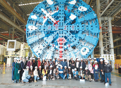 外媒記者來(lái)到位于江蘇常熟市的中交天和機(jī)械設(shè)備有限公司生產(chǎn)制造車間,與“云擎2號(hào)”盾構(gòu)機(jī)合影留念。環(huán)球網(wǎng)供圖