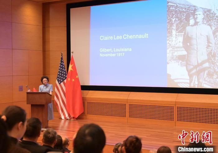 在發(fā)言的結(jié)尾,陳美麗摘讀了一段陳納德日記——“很多次我感到挫敗而準(zhǔn)備放棄,而每當(dāng)面臨抉擇之際,我選擇堅(jiān)守。我一生都在奮戰(zhàn),直至終點(diǎn)。我深知,我也會(huì)見證這場抗戰(zhàn)的終點(diǎn)”——她接著說,懷著同樣的堅(jiān)定決心,讓我們共同努力,克服障礙,共同促進(jìn)美中兩國的友誼與合作。