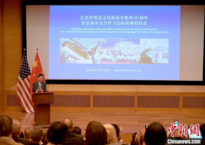 當(dāng)?shù)貢r(shí)間3月25日,華盛頓,中國駐美大使館舉辦“紀(jì)念世界反法西斯戰(zhàn)爭勝利80周年暨弘揚(yáng)中美合作飛虎隊(duì)精神”招待會(huì)。圖為中國駐美大使謝鋒致辭。中新社記者 陳孟統(tǒng) 攝