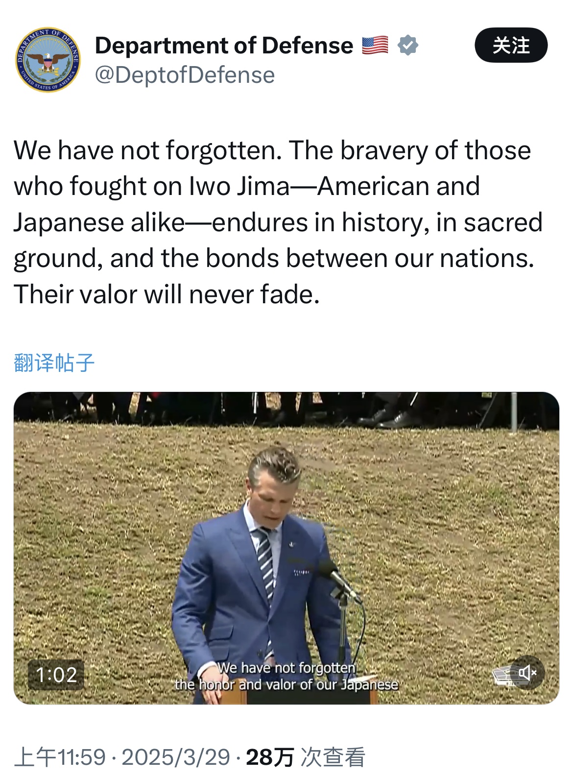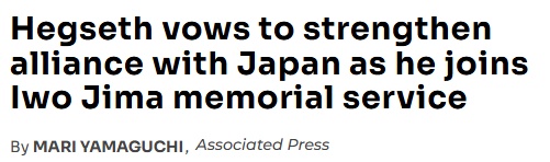 外媒報道:赫格塞思在參加硫磺島戰(zhàn)役紀(jì)念儀式上,誓言要加強與日本的聯(lián)盟
