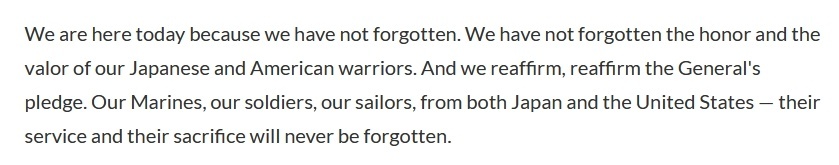 赫格塞思在致辭時稱:“我們不會忘記在硫磺島作戰(zhàn)的美國和日本士兵展現(xiàn)出的勇敢精神。這種精神,將在歷史的長河中、在這片神圣的土地上,以及美日兩國的盟友關(guān)系間永垂不朽,他們的英勇事跡永不褪色?!?/p>