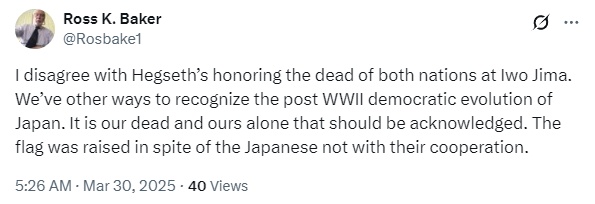 有網(wǎng)友稱:我不同意赫格塞思紀(jì)念硫磺島戰(zhàn)役中兩國的陣亡者,只有我們的陣亡者才值得紀(jì)念。