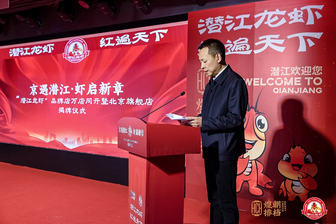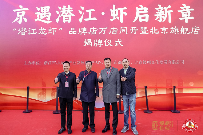 湖北省人民政府駐北京辦事處黨組書記、主任周勇,湖北省潛江市委常委、統(tǒng)戰(zhàn)部部長王緒軍,中國農(nóng)業(yè)技術(shù)推廣協(xié)會會長陳生斗,煌朝排檔“潛江龍蝦北京旗艦店”董事長楊代龍共同為“潛江龍蝦北京旗艦店”揭牌
