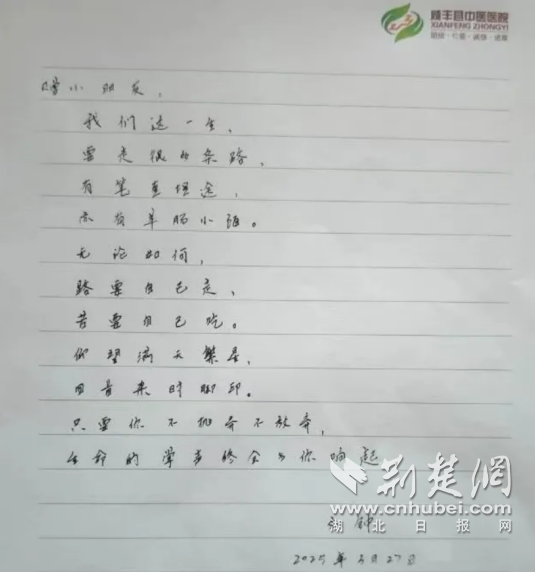 荊楚網(wǎng)(湖北日?qǐng)?bào)網(wǎng))訊(通訊員吳歡、湯應(yīng)彬)“我們這一生要走很多條路,有筆直坦途,亦有羊腸小陌 …… 只要你不拋棄不放棄,生命的掌聲終會(huì)為你響起!”3月27日,武漢市第一醫(yī)院幫扶咸豐縣中醫(yī)醫(yī)院皮膚科專家劉鐘,上門為戴軍(化名)復(fù)診時(shí),為他寫下暖心“醫(yī)囑”。