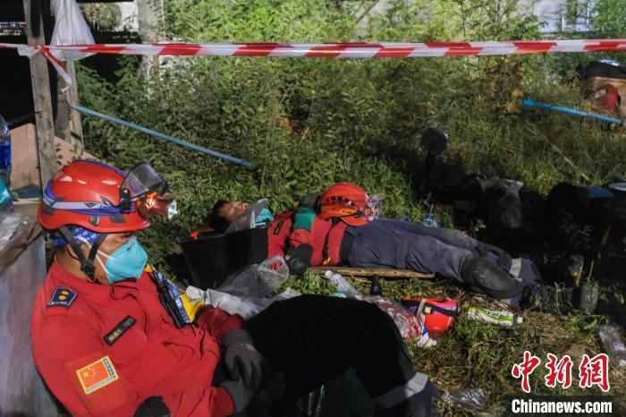 夜色愈加深重,天氣悶熱依舊,各救援隊(duì)顧不上吃晚飯,輪番上陣,救援人員無一不渾身濕透。輪換期間,有救援人員和衣而臥,躺在草坪上休息。