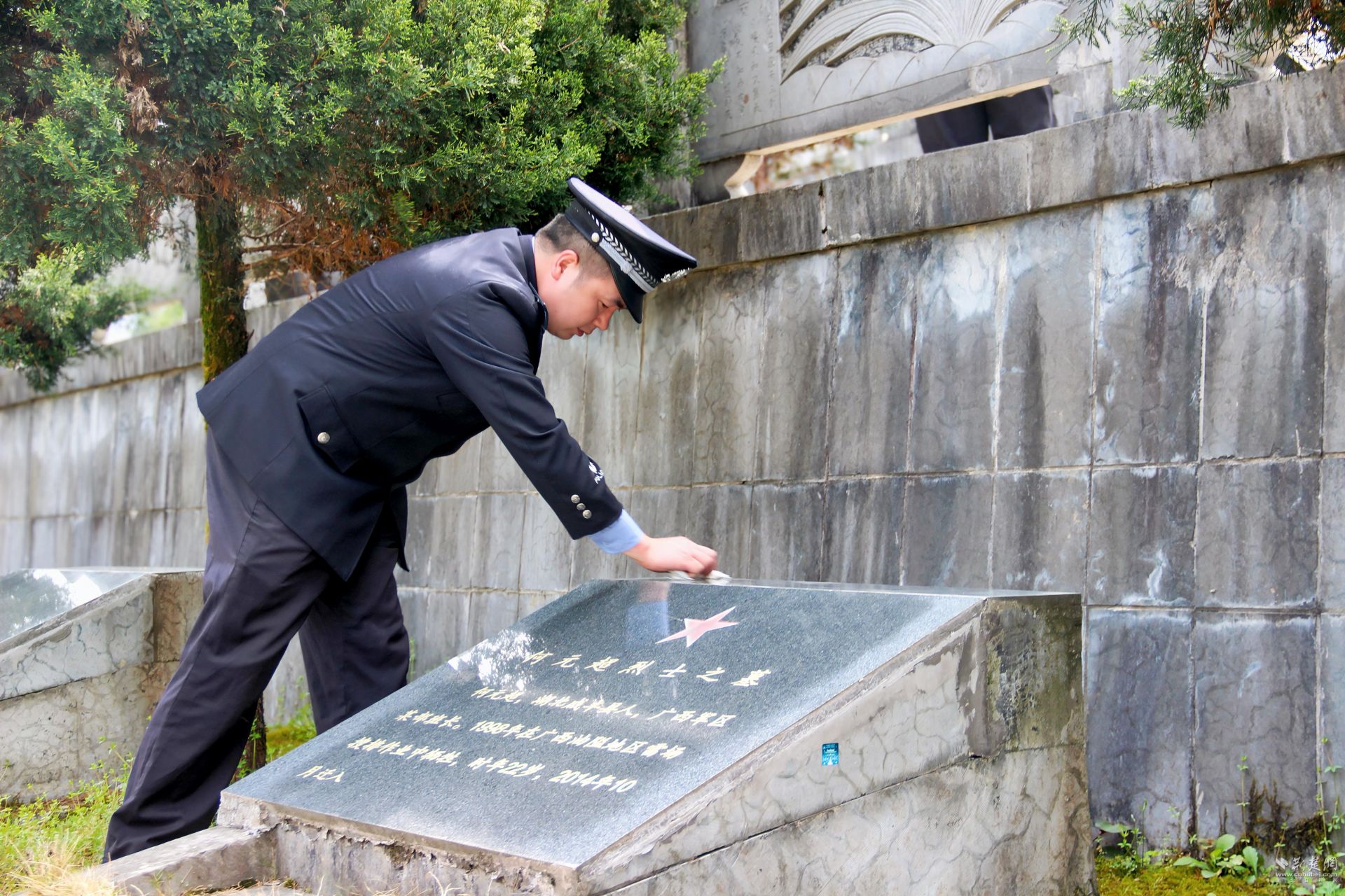 活動最后,全體人員在陵園工作人員指導(dǎo)下開展志愿服務(wù)。兩組人員分別負(fù)責(zé)擦拭墓碑、清理步道落葉等環(huán)境維護(hù)工作,用實(shí)際行動表達(dá)對先烈的追思。