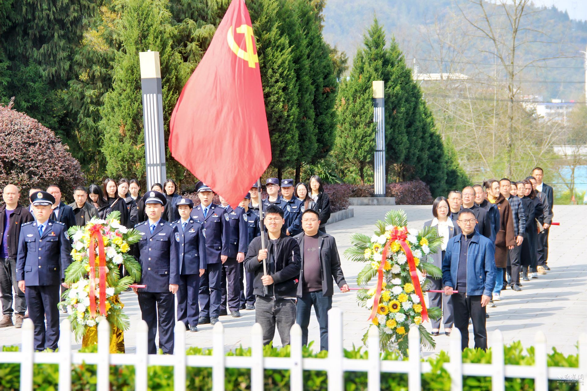 當(dāng)日上午9點(diǎn),全體人員在紀(jì)念碑前整齊列隊(duì)。民警與醫(yī)護(hù)人員代表向紀(jì)念碑敬獻(xiàn)花籃,全體肅立默哀三分鐘,深切緬懷革命先烈。