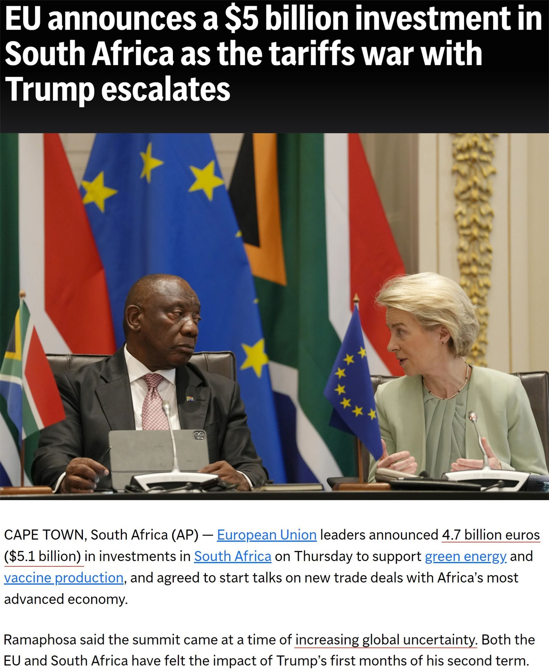 3月中旬,第八屆南非-歐盟峰會(huì)在南非開普敦舉行。會(huì)上,歐盟委員會(huì)主席馮德萊恩宣布了一項(xiàng)47億歐元的對(duì)南非投資計(jì)劃。馮德萊恩強(qiáng)調(diào),這一投資符合雙方利益。