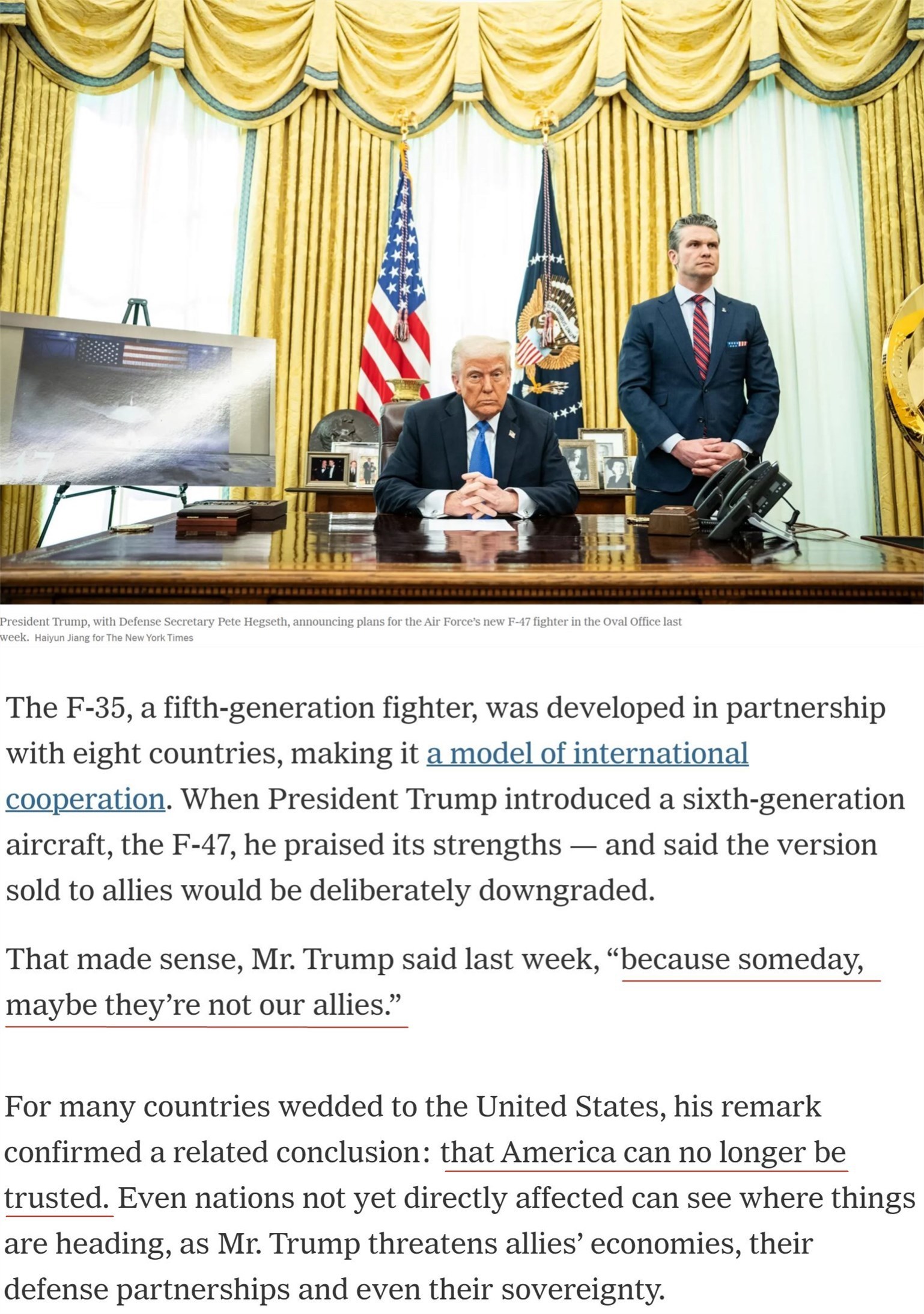 在宣布波音公司獲得戰(zhàn)機(jī)合同的新聞發(fā)布會(huì)上,美國(guó)總統(tǒng)特朗普一邊贊嘆F-47的性能,一邊又特意強(qiáng)調(diào),未來(lái)只會(huì)將降級(jí)后的機(jī)型賣給盟友。