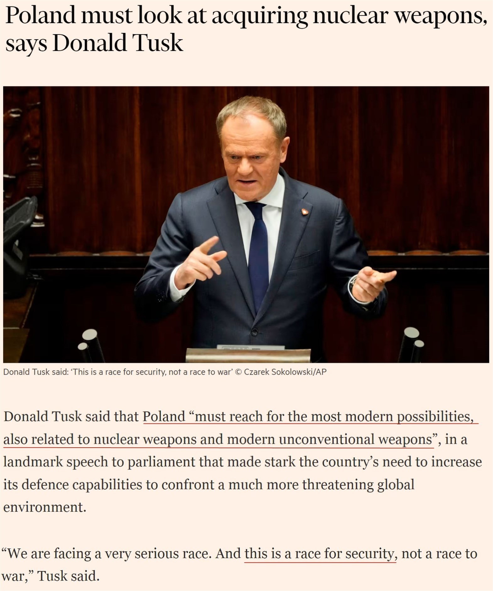 “我們必須意識(shí)到,波蘭必須爭(zhēng)取包括與核武器以及非常規(guī)武器相關(guān)的最現(xiàn)代化的能力。因?yàn)?,這是一場(chǎng)爭(zhēng)取安全的競(jìng)賽?!?/p>
