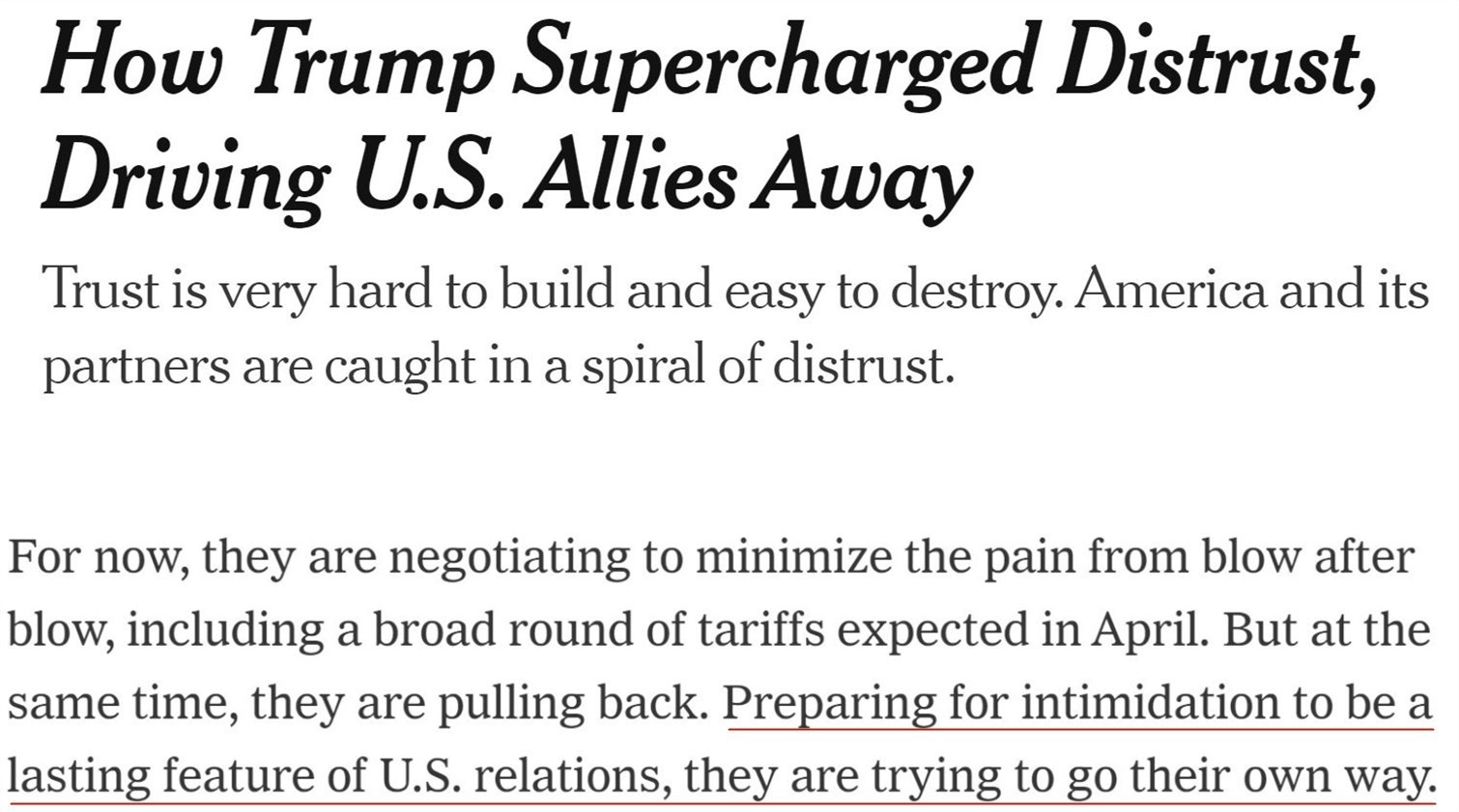 隨著特朗普對(duì)盟友的經(jīng)濟(jì)、防務(wù)甚至國(guó)家主權(quán)發(fā)出威脅,就連尚未受到直接影響的國(guó)家也已看到了事態(tài)發(fā)展的走向。美國(guó)媒體坦言,“美國(guó)不再值得信任”。