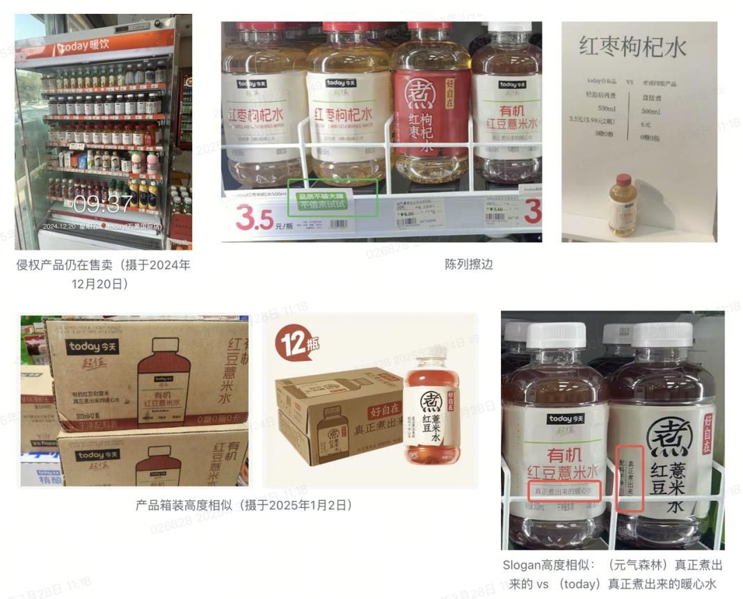 2025年3月27日,記者對(duì)此聯(lián)系了另一當(dāng)事企業(yè)元?dú)馍?。元?dú)馍址矫姹硎荆?024年12月,元?dú)馍制放品骄鸵寻l(fā)現(xiàn)Today的侵權(quán)行為,并向其發(fā)送了正式的行為警告函。Today在當(dāng)月回復(fù)稱,會(huì)立即停止使用,并對(duì)侵權(quán)瓶型進(jìn)行修改。