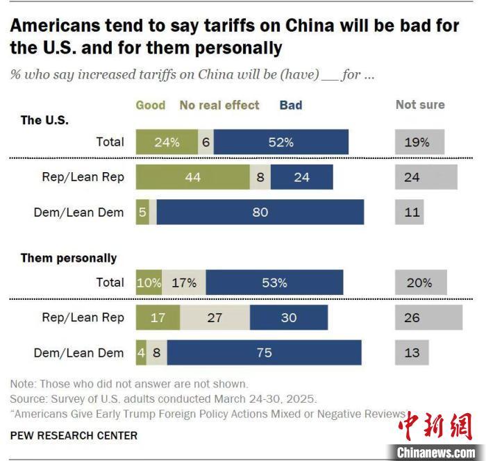 結(jié)果顯示,在對華加征關(guān)稅問題上,52%受訪者認為將對美國不利,24%認為將對美國有利;53%受訪者認為將對個人生活產(chǎn)生負面影響,10%認為將對個人有利。同時,約五分之一的受訪者表示,對關(guān)稅帶來的影響“不確定”。