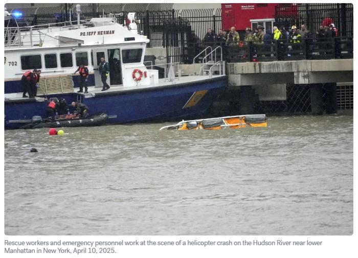 紐約市長亞當斯在簡報會上表示:“我們對遇難者家屬和機上人員深感悲痛。”墜機視頻顯示,直升機在墜入水中時沒有尾槳和主旋翼葉片。官員們表示,直升機是倒扣著墜入水中的。