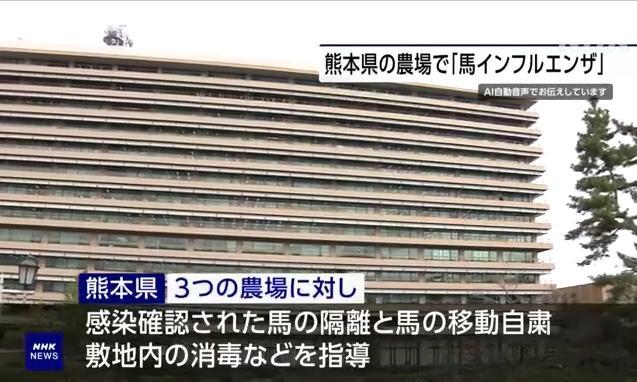 日本廣播協(xié)會(huì)(NHK)報(bào)道稱(chēng),目前,熊本縣正針對(duì)這3家養(yǎng)馬場(chǎng)采取隔離感染馬匹、避免轉(zhuǎn)移飼養(yǎng)馬匹、設(shè)施消毒等措施。