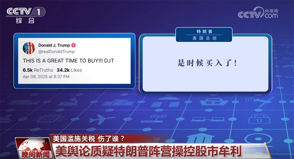 據美國媒體報道稱,特朗普在暫緩加征關稅決定公布前差不多3小時,也就是美股開盤后不久,通過社交媒體發(fā)文稱:“現在是買入的絕佳時機!DJT”。據美聯社說法,雖然特朗普有時以自己全名的英文縮寫DJT強調是自己親自所寫,但DJT也代表“真實社交”平臺母公司特朗普媒體科技集團的股票。該股價格當日收盤上漲了約22%,為大盤漲幅的兩倍左右。特朗普持股53%,估算下來,特朗普家族因這波股市暴漲一天就獲利4億美元以上。社交媒體視頻顯示,當天特朗普在白宮還頗為驕傲地介紹身邊的美國富豪在股市里大賺一筆。