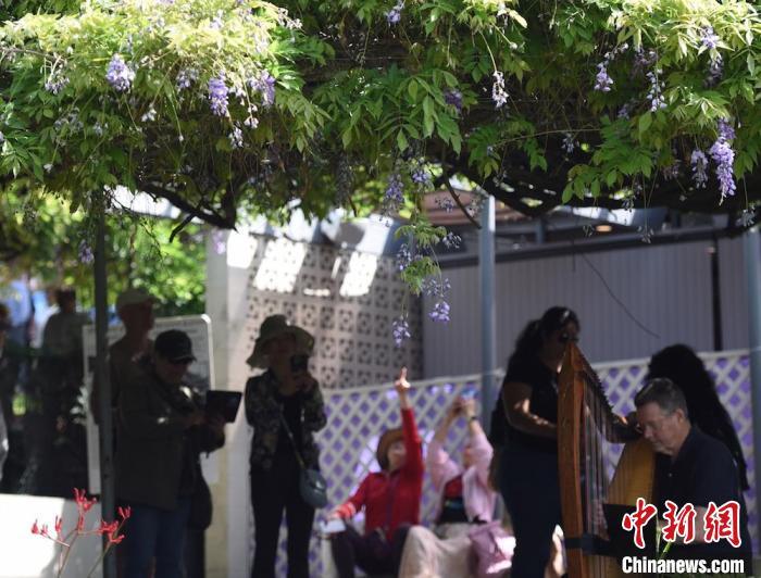 當(dāng)?shù)貢r(shí)間4月12日,2025年紫藤花節(jié)在美國加利福尼亞州洛杉磯郡塞拉馬德雷市舉行。圖為人們?cè)凇白咸倩▓@”欣賞音樂、觀賞花朵?!≈行律缬浾?張朔 攝