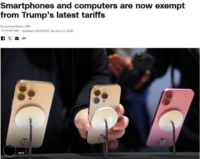 美國海關(guān)與邊境保護(hù)局發(fā)布的文件顯示,這些產(chǎn)品被排除在政府對(duì)貿(mào)易伙伴實(shí)施的所謂“對(duì)等關(guān)稅”之外?;砻獾漠a(chǎn)品適用于4月5日以后進(jìn)入美國的電子產(chǎn)品,已經(jīng)支付的“對(duì)等關(guān)稅”可以尋求退款。
