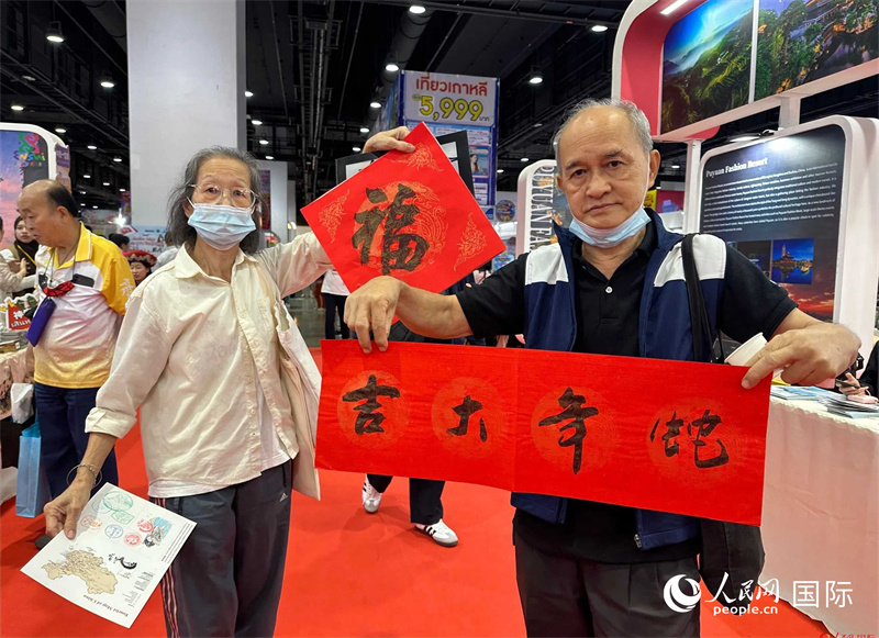 2025蛇年春節(jié),泰國市民展示他們領(lǐng)到的華人手寫春聯(lián)。人民網(wǎng)記者 簡承淵攝