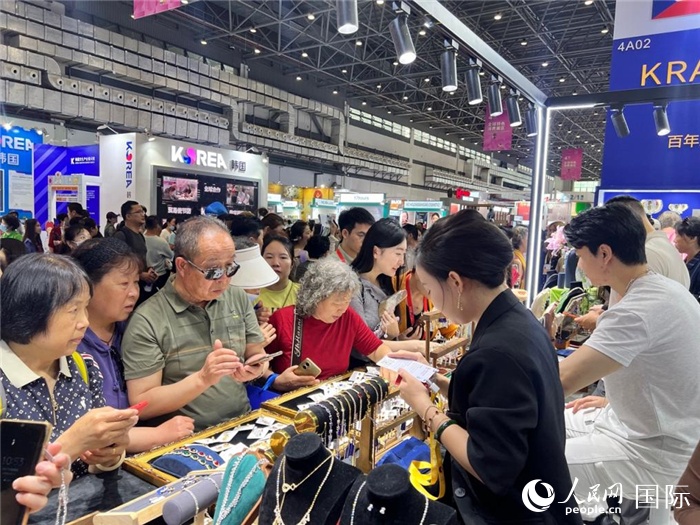 消博會(huì)展館內(nèi),觀展群眾購買展出商品。人民網(wǎng)記者 趙瞳攝