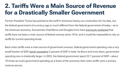 而且,一個世紀前的美國政府與今天大不相同。關稅是政府收入的主要來源時,聯邦政府支出僅占GDP的很小一部分,僅略高于GDP總額的2%。2023年,聯邦政府支出占GDP的22.7%,是之前百分比的十倍。所得稅帶來的收入顯然無法被關稅取代。