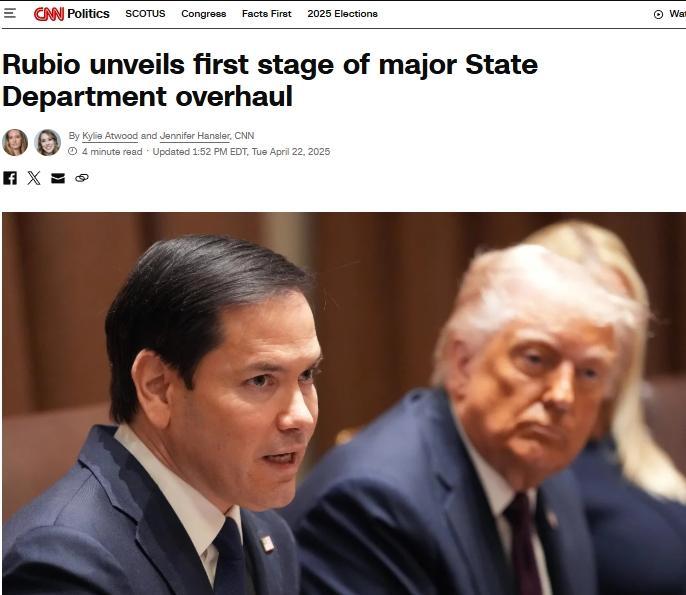 中新網(wǎng)4月23日電 綜合美媒報道,當?shù)貢r間22日,美國國務(wù)卿魯比奧宣布,美國務(wù)院將實施全面重組計劃,落實美國總統(tǒng)特朗普宣揚的“美國優(yōu)先”外交政策。