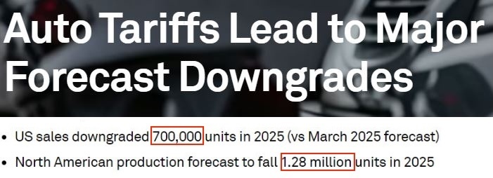 根據(jù)標普全球最新報告,如果美國持續(xù)對進口汽車加征高額關(guān)稅,今年美國汽車銷量將減少約70萬輛,北美地區(qū)的汽車產(chǎn)量將減少128萬輛。