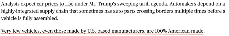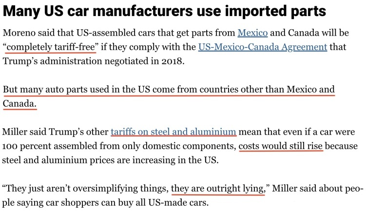 由于汽車制造商依賴高度整合的全球供應鏈,汽車零部件在整車組裝完成之前需要經(jīng)過多次跨境運輸,“即使是由美國制造商生產(chǎn)的汽車也難有真正的100%美國制造”。