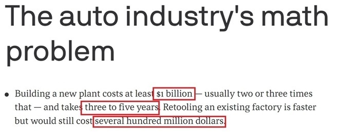 有美媒報道稱,在美國新建一家汽車工廠的成本往往在10億至30億美元之間,而且需要三到五年時間。依托已有工廠改造生產(chǎn)線雖然會相對快些,但仍需要花費數(shù)億美元。
