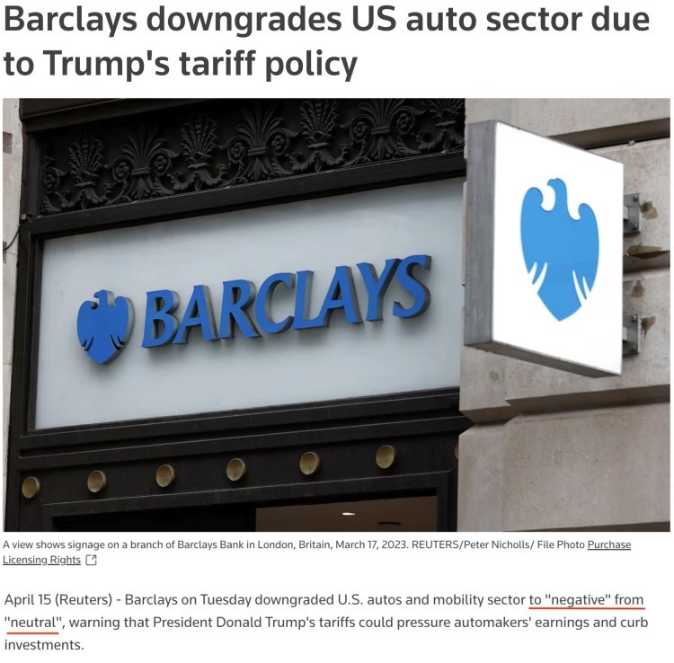 英國巴克萊銀行日前將美國汽車和移動出行行業(yè)的評級從“中性”下調(diào)至“負面”,并警告稱,美國的關(guān)稅可能會給汽車制造商的盈利帶來壓力并抑制投資。