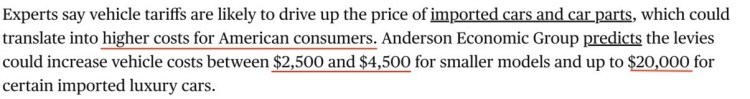 據(jù)美國安德森經(jīng)濟集團估算,關(guān)稅可能會使每輛小型汽車價格平均增加2500至4500美元,某些進口豪華車的單價可能會最多增加2萬美元。