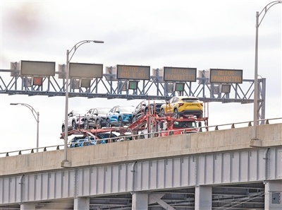 針對美國新關(guān)稅政策,加拿大對美國汽車對等征收25%關(guān)稅措施已于日前生效。圖為近日,在加拿大安大略省尼亞加拉瀑布市加美邊境地帶,一輛滿載的汽車運(yùn)輸車通過劉易斯頓—昆斯頓橋開往加拿大。鄒 崢攝(新華社發(fā))