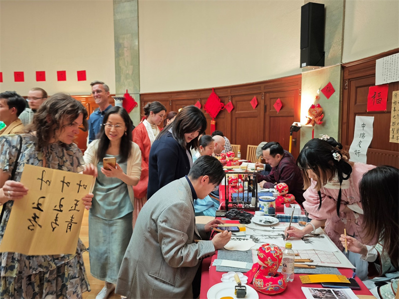 隨后,來賓們根據(jù)自己的興趣進(jìn)行不同的中華文化體驗(yàn),來自瑞典的青少年下起了象棋;在書法展示區(qū),大家排起長(zhǎng)隊(duì),等待用中文寫下自己的名字,學(xué)習(xí)瑞典、中國(guó)、中瑞友好等漢字的寫法;在中國(guó)畫展示區(qū),大家一起做版畫、畫扇面,欣賞工筆畫的精巧,以及寫意畫的意蘊(yùn);在漢服展示和手工制作區(qū)域,來賓踴躍試穿漢服并合影,制作燈籠、剪紙等中華傳統(tǒng)工藝品。