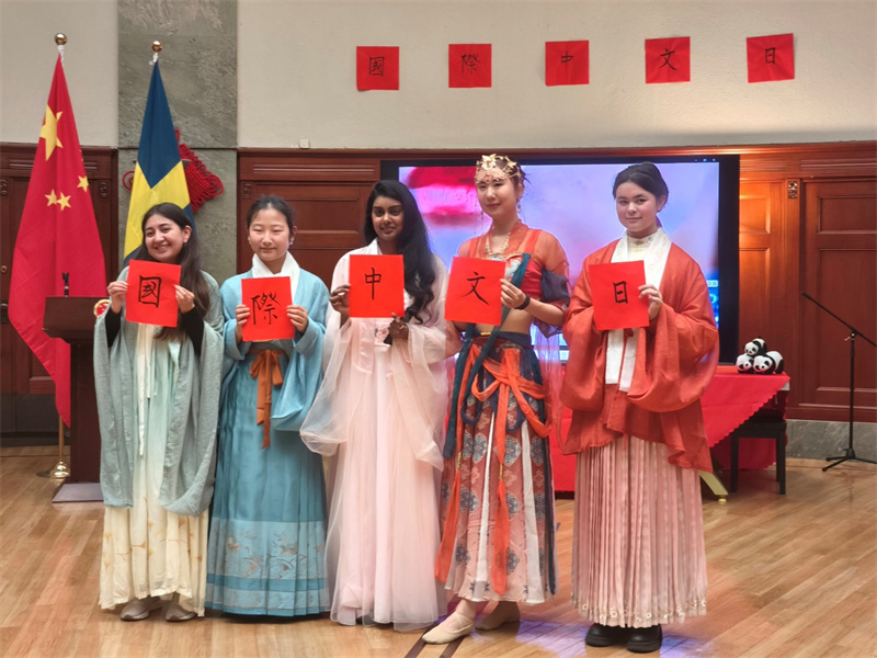 來賓展示“國(guó)際中文日”字樣。中國(guó)駐哥德堡總領(lǐng)館供圖