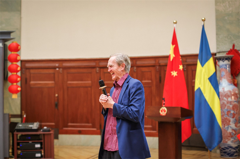 瑞典著名語(yǔ)言文化學(xué)者延斯·奧爾伍德教授發(fā)言。中國(guó)駐哥德堡總領(lǐng)館供圖