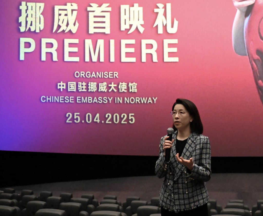 中國駐挪威大使侯悅出席《哪吒2》首映活動并致辭。中國駐挪威大使館供圖